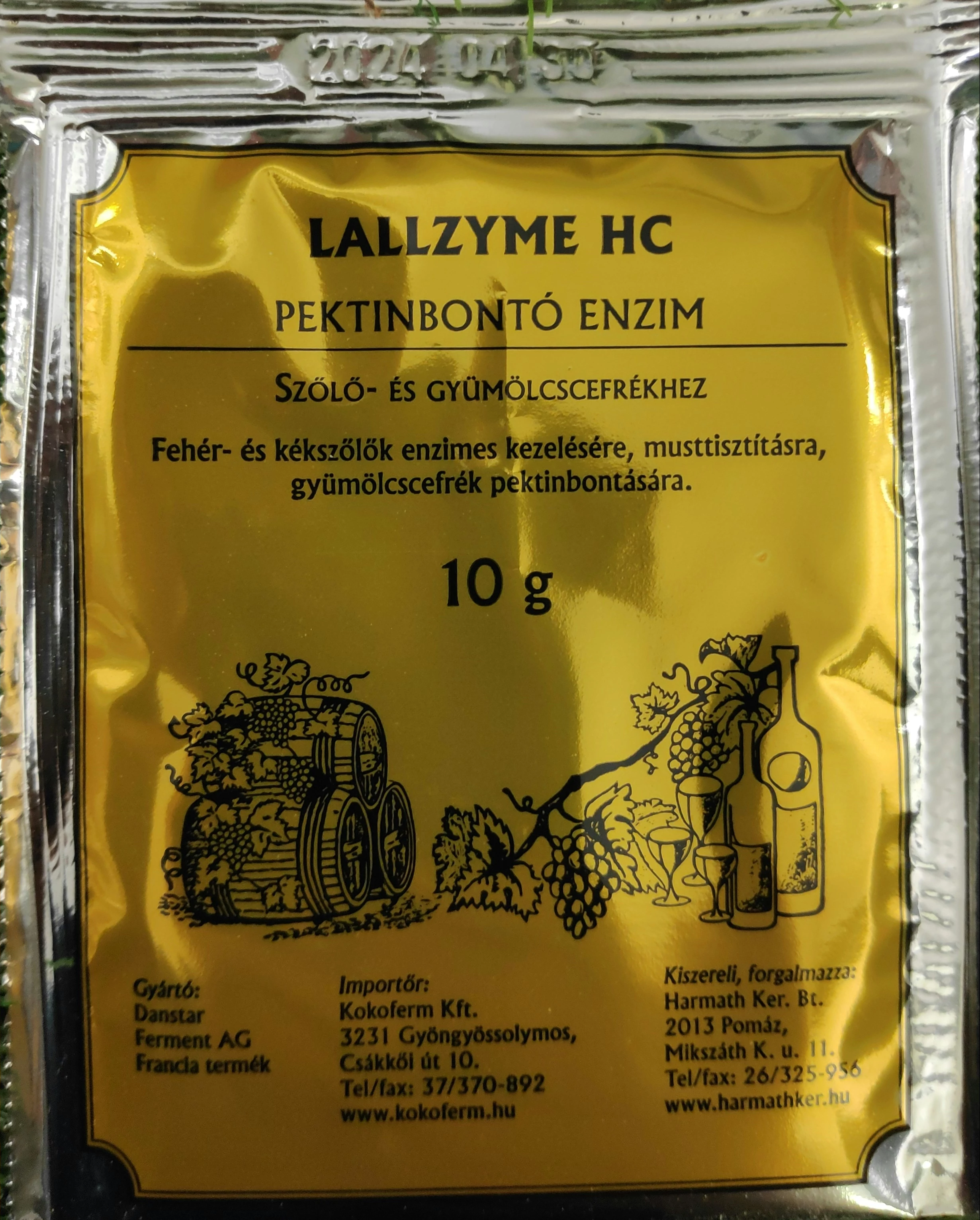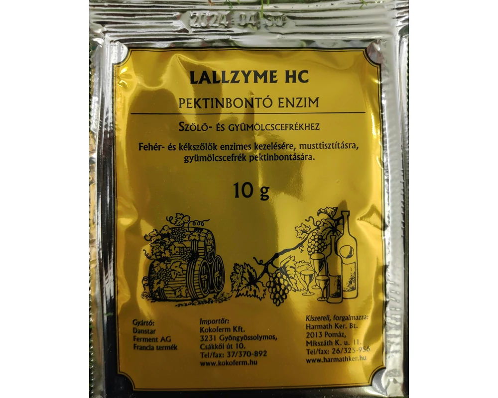 ALKALMAZÁS: Pektinbontásra, héjonáztatáshoz és a mustok tisztítására alkalmas pektinbontó enzimkészítmény. A szőlőhöz feltárás során adagolandó. A Lallzyme HC hatására nagyobb a lényeredék, amely elsősorban színléként jelentkezik. Kisebb a barnulást okozó polifenolok koncentrációja, mivel a préselés nyomásigényét csökkenti. Hatására gyorsulnak a mustok tisztulási folyamatai nyálkázásnál, ülepítésnél, szeparációnál. Ülepítéses musttisztításnál tömörebb az üledék. Javul az újborok deríthetősége, szűrhetősége. Erősen rothadt szőlő esetén a nagyobb hatékonyságú és gyorsabb musttisztításhoz mindenképpen javasolt a Lallzyme HC alkalmazása. Rothadt termés esetén azonban ne a feltárás előtt a fogadógaratba adagoljuk a készítményt! Alkalmazzunk minnél gyorsabb szőlőfeldolgozást, majd a mustot kénezzük. A must kénezése után 1 – 1,5 g/hl adagban alkalmazzuk a HC tisztítóenzimet. A kénessav, a kénessavas nyálkázás koncentrációtartományában nem gátolja az enzimműködést. A megfelelő enzimaktivitás érdekében a mustot ne hűtsük 8 C alá.